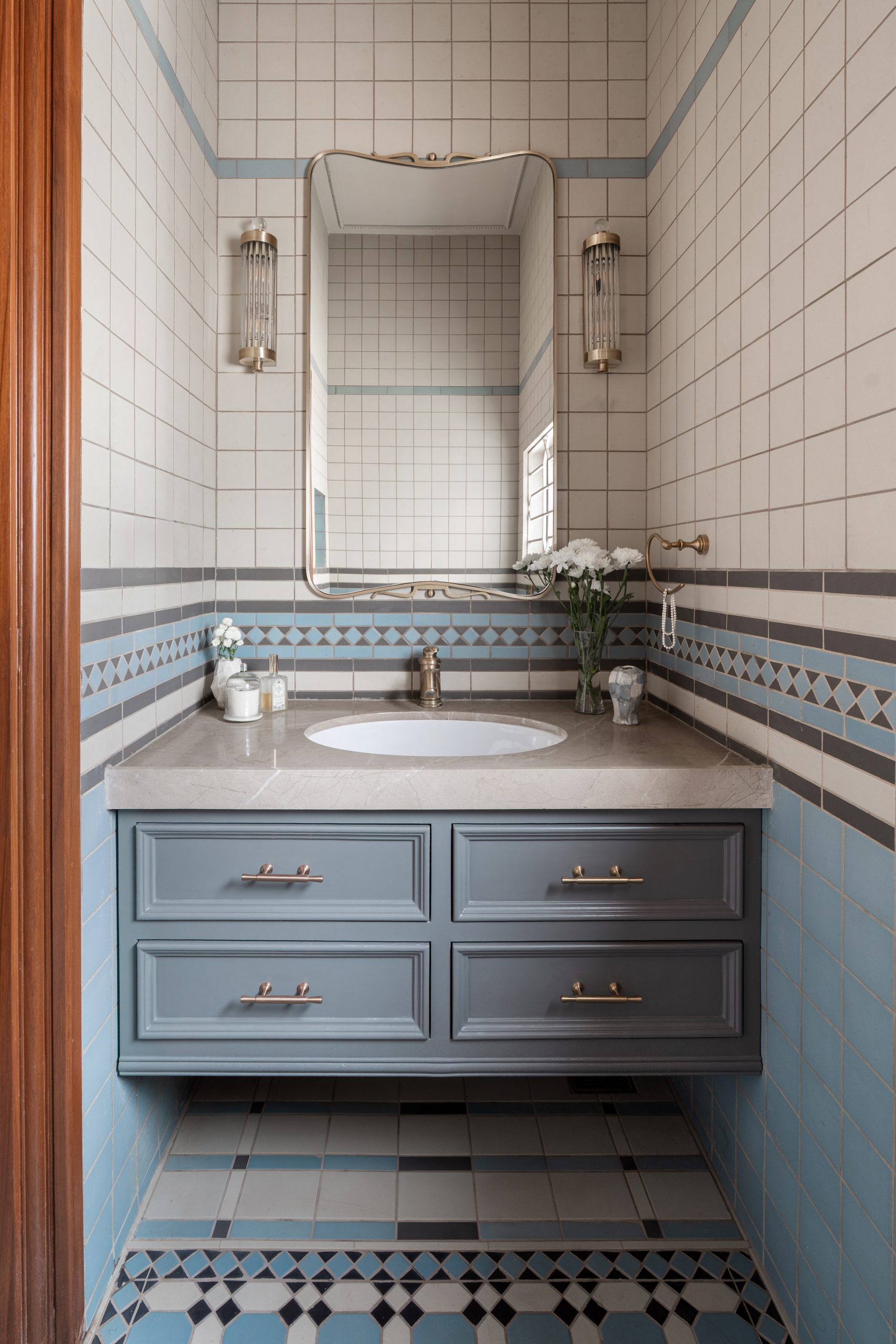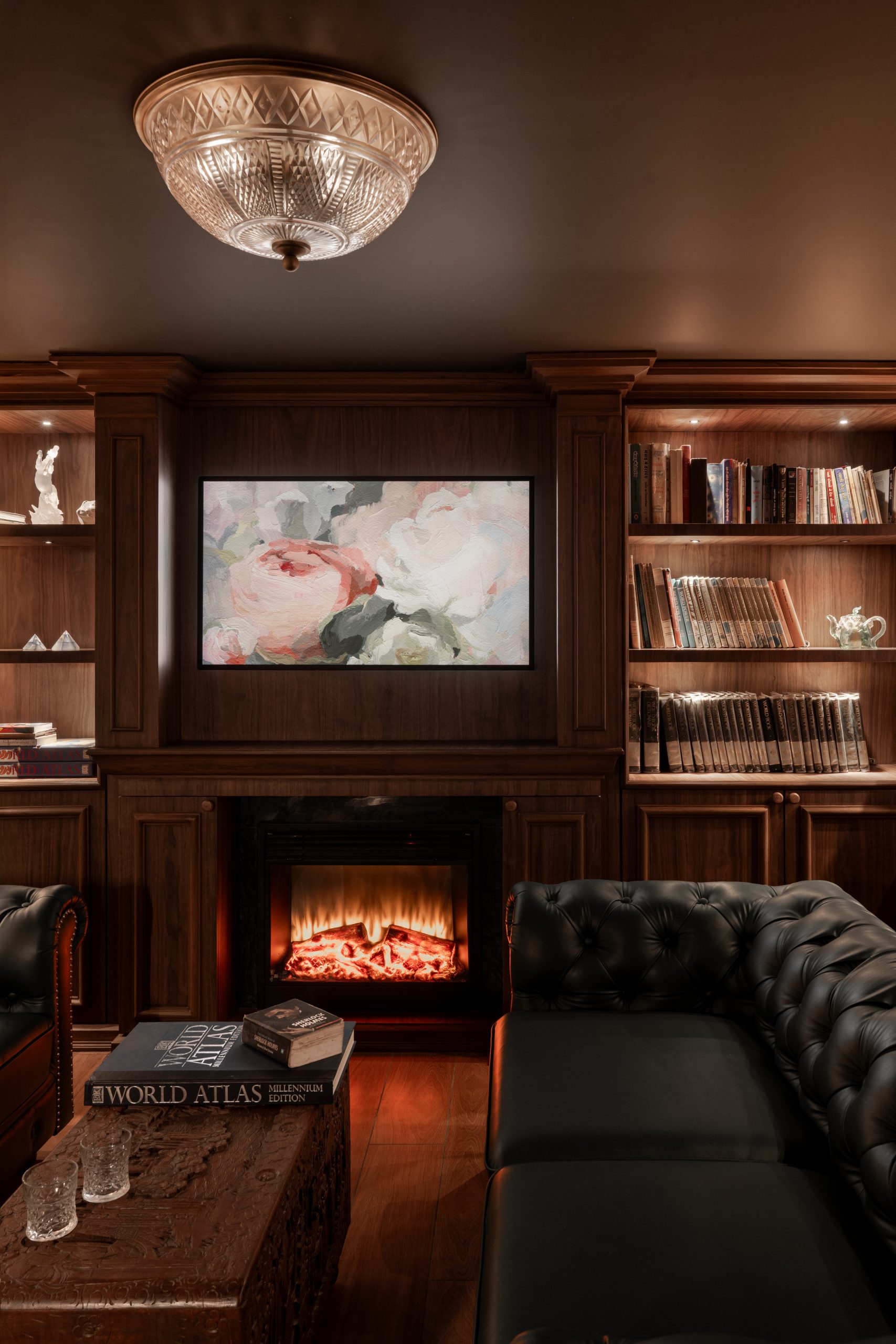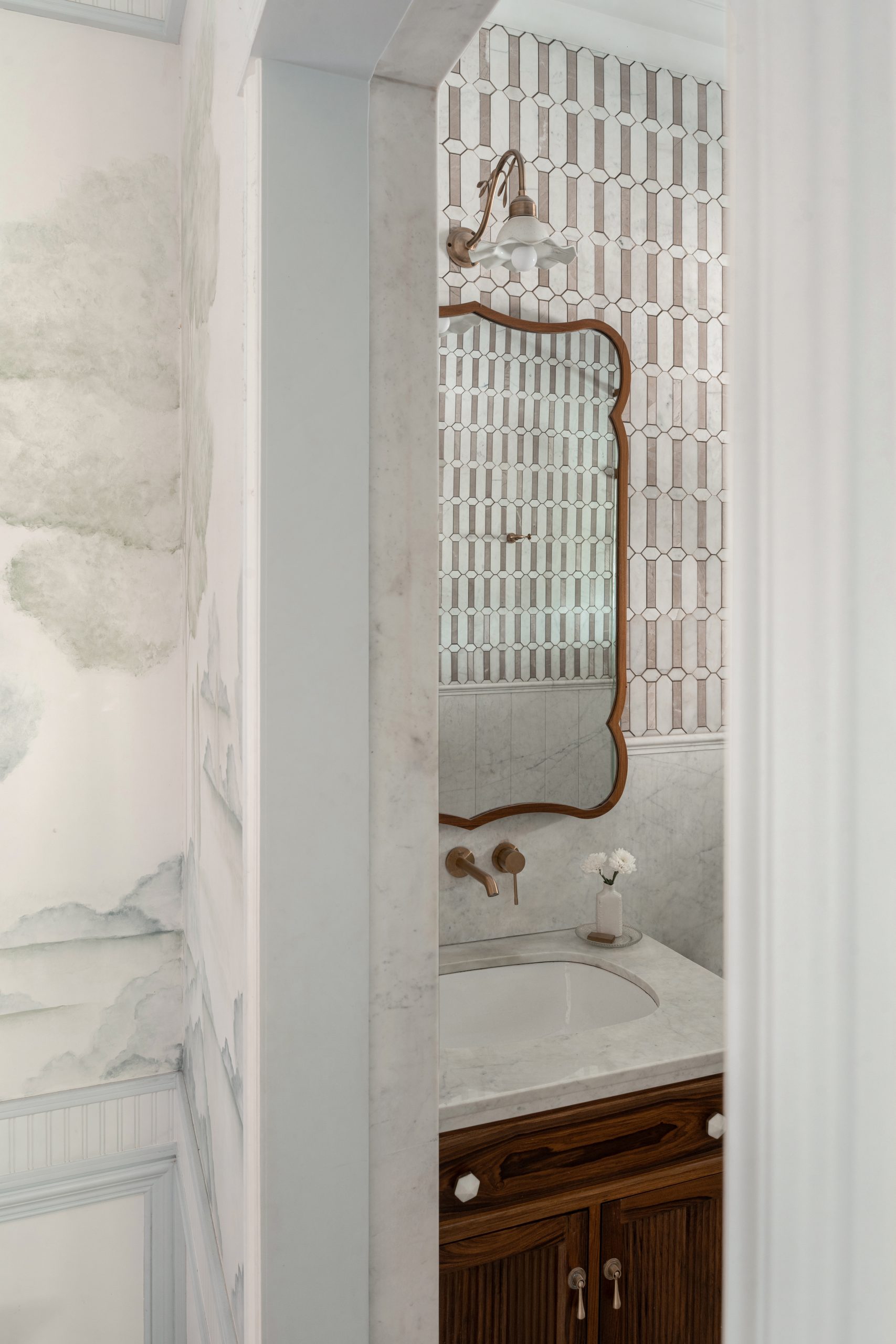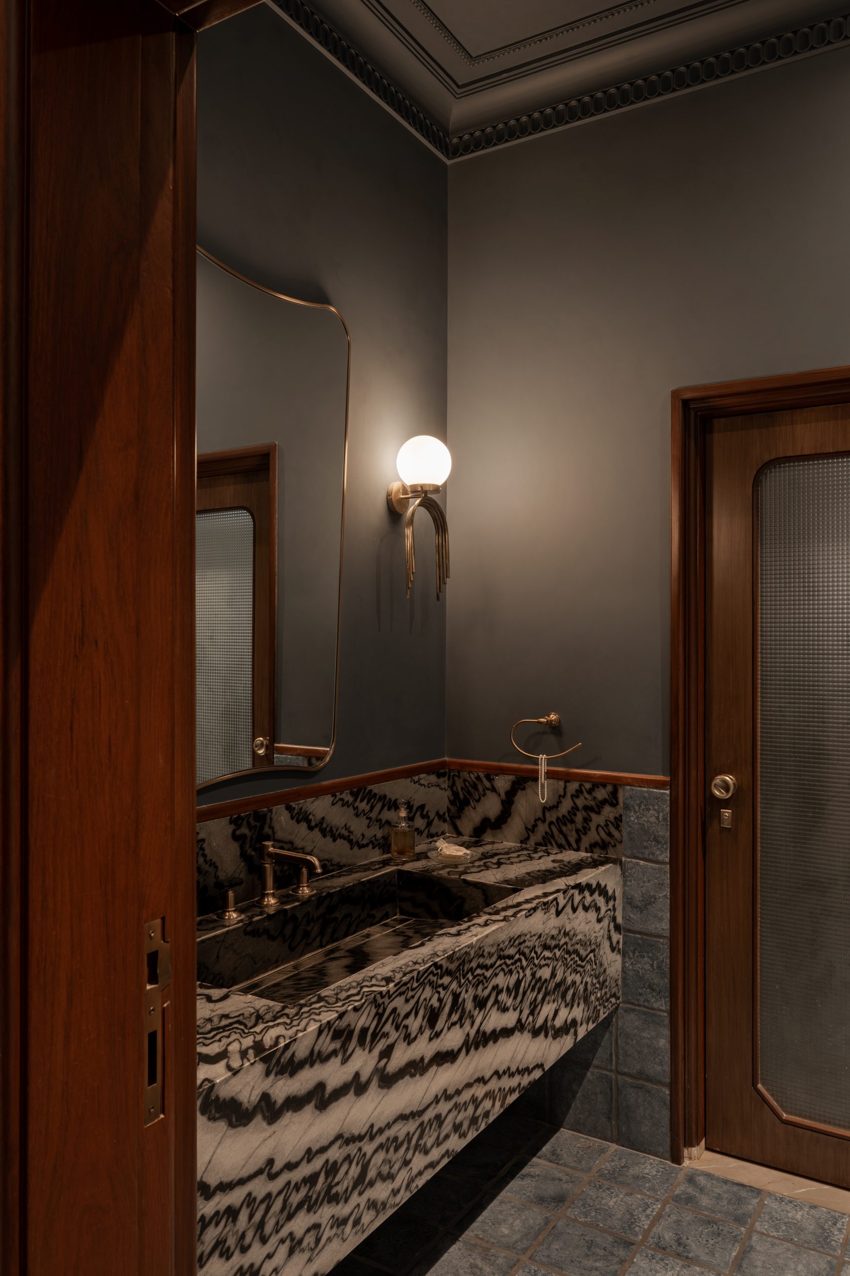 Textural contrasts — from marble-clad baths to matte black cabinetry — meet a palette of soft creams, natural woods, and deep blues. Each space flows into the next, telling a story that is luxurious yet lived-in. Whether it’s a quiet reading nook wrapped in dark walnut or a sunlit study anchored by modern geometry, The Mayflower balances history, craft, and comfort.